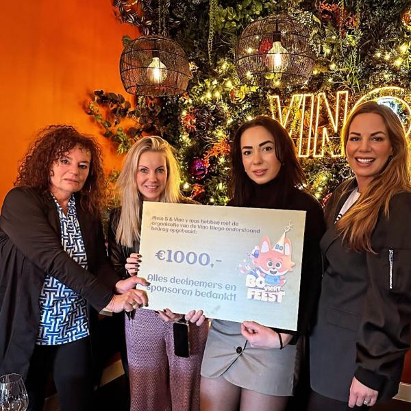 Vandaag hebben we uit handen van Hanna van Plein 5 en Jorieke van Vinoymas deze mooie cheque ter waarde van € 1000,- mogen ontvangen. Dit bedrag hebben zij samen met de deelnemers en sponsoren van de Vino Bingo binnengehaald! Wat een ontzettend mooi bedrag!! Mascotte BO kwam nog even langs tijdens de bingo en heeft enorm genoten van de sfeer.